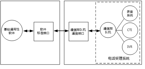 基础通用性软件主要实现呼入弹屏、历史呼叫自动检索、数据项录入、工单流转、知识库检索等功能,通过CTI标准协议(如CSTA、CallPath、TAPI、TSAPI和SIP软交换协议),实现基础通用性软件与电话受理系统的接口对接。如图3-1所示: