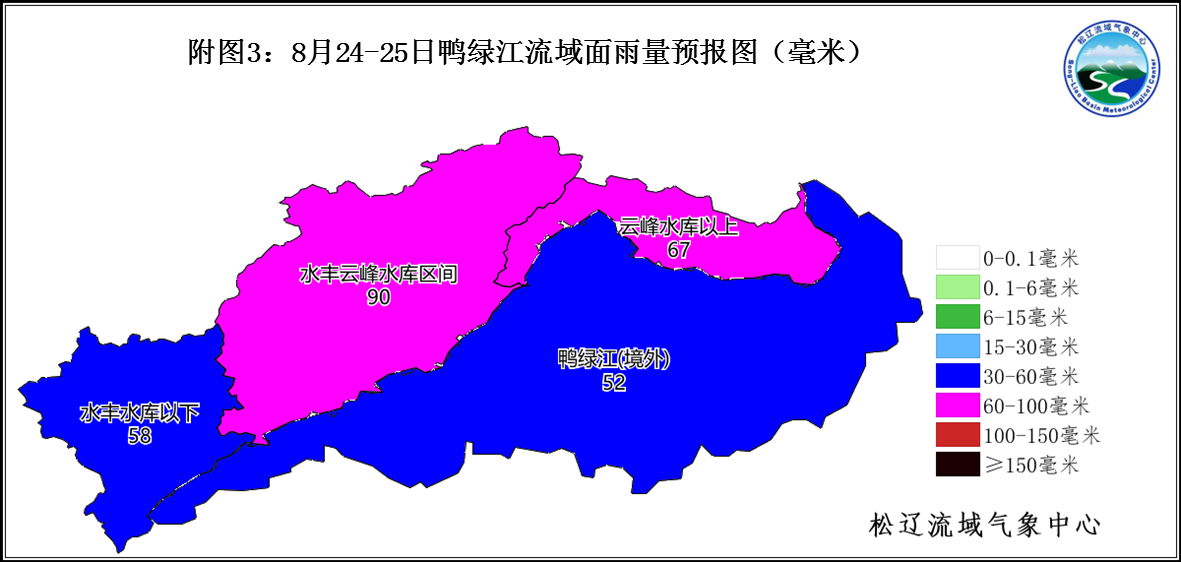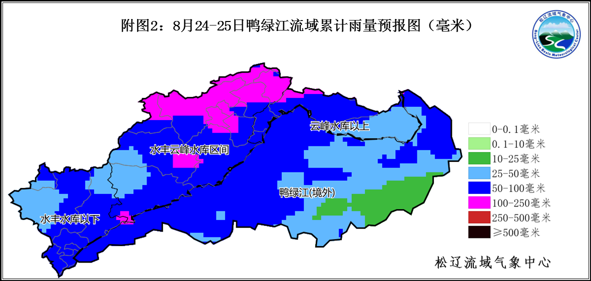 此次过程,鸭绿江流域境内和境外降水均较为明显,特别是流域的中上游(见附图2和附图3)。其中,境内降水主要集中在25日凌晨到傍晚,境外降水主要集中在25日白天到夜间。