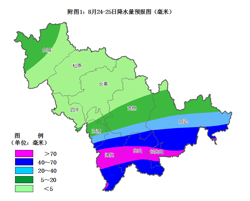 预计8月24日凌晨-25日夜间,我省南部和东部将有一次明显降水天气,降水主要集中在25日凌晨到傍晚。通化、白山、延边南部、长白山保护开发区有大到暴雨,部分地方有大暴雨。受其影响,鸭绿江、图们江、浑江等流域中小河流洪水风险高,特别是鸭绿江流域还需防范前期降水和境外客水带来的叠加影响;山区部分地方发生山洪、地质灾害气象风险较高。