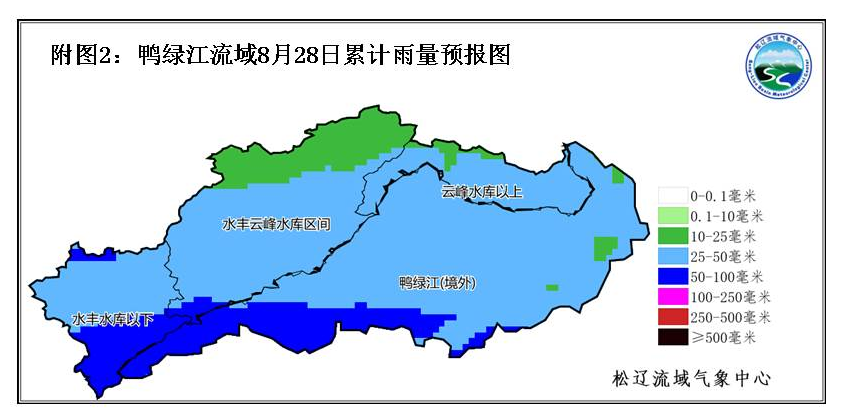 此次过程,鸭绿江流域境内和境外降水均较为明显,特别是流域的中下游(见附图2和附图3)。其中,境内降水主要集中在28日早晨到傍晚,境外降水主要集中在28日上午到前半夜。