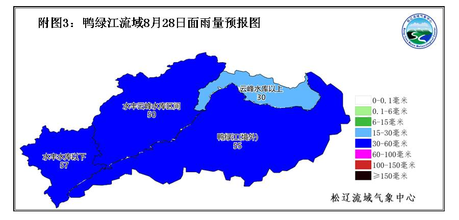 流域境外部分:集安以上过程累计雨量30~60毫米,面雨量为45毫米左右;集安以下过程累计雨量55~80毫米,面雨量为60毫米左右。