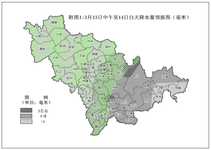 过程降水量:吉林、通化、白山、延边西部和北部(敦化、安图、和龙、汪清)、长白山保护开发区有雨夹雪或小雪,其中吉林东北部(蛟河)、通化北部(辉南)、白山北部(靖宇、抚松)、延边西部(敦化)部分地方有中雪,过程降水量为1~2毫米,局部可达3毫米左右;白城、松原、四平西部(双辽)有小雨转雨夹雪或小雪,长春、四平东部(市区、梨树、伊通)、辽源有雨夹雪转小雪,延边东南部(延吉、龙井、图们、珲春)有小雪,过程降水量不足1毫米(附图1)。具体预报如下: