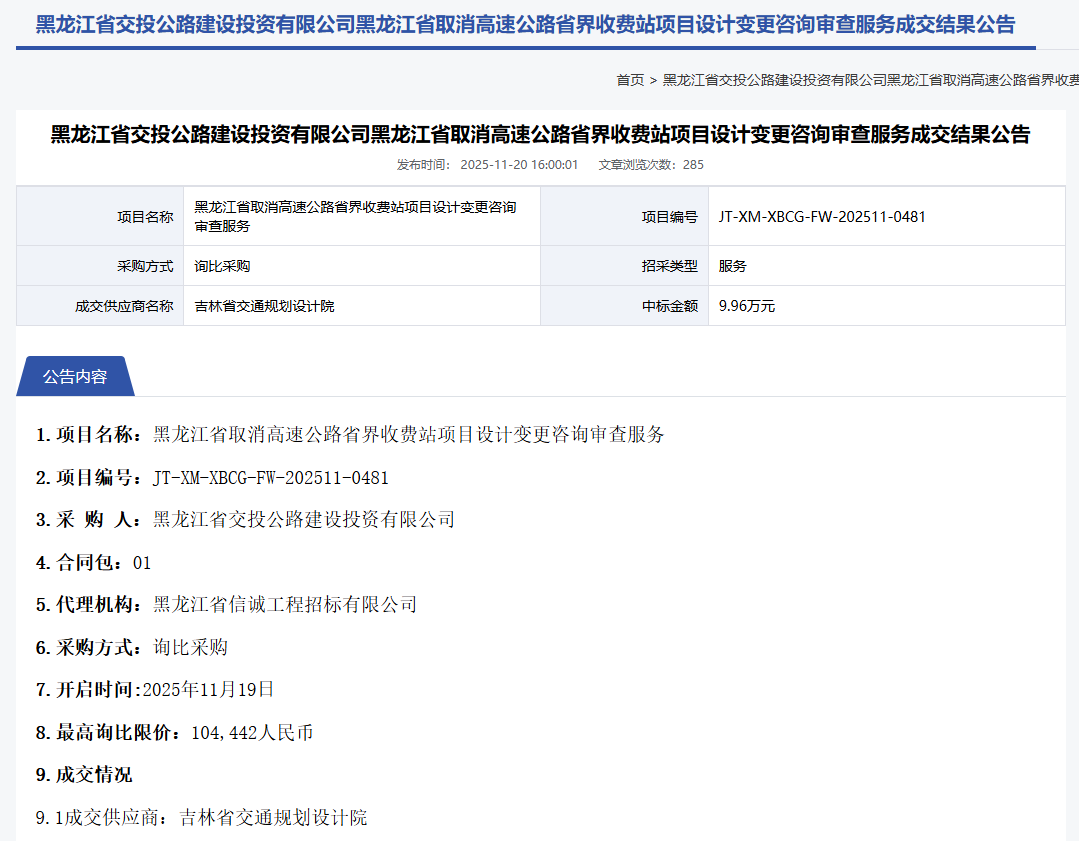 近日,在院智能交通与信息技术中心与经营发展部的通力协作下,我院成功中标《黑龙江省取消高速公路省界收费站项目设计变更咨询审查服务》项目,再次彰显了我院在交通数字化转型与智慧公路建设领域的专业技术实力和行业影响力。