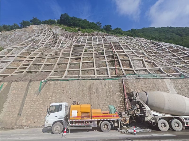 02标段高边坡锚杆(索)框架梁、边坡绿化等施工进展顺利。