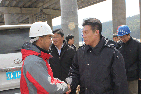 常晓春一行先后实地踏察了08合同段水上四跨松花江桥梁施工现场和抚松互通、里马鹿沟施工现场。在08标段1号预制场,在听取省高建局相关人员现场汇报后,常晓春对省高建局前一阶段采取有效措施、克服诸多困难,实现提前开、复工的工作成绩给予了高度评价和充分肯定。就下一阶段工作,常晓春强调:营松高速公路全面建成后将对加快国家高速公路网、东北区域骨架公路网和全省高速公路网形成,改善区域交通运输条件,加快东北地区老工业基地振兴,促进区域经济和旅游业发展,加强国防建设和国防安全等具有重要意义,任务艰巨,责任重大。各单位、各部门要高度重视,将之作为践行群众路线的具体举措,科学谋划,克服困难,千方百计确保工程质量和安全生产,强化各项保证措施,主动作为,积极与地方政府沟通协调,做好征地拆迁工作,科学组织、细化工期,加大资源投入,加快建设速度,力争提前通车,为区域经济发展、长白山旅游开发和人民群众出行创造便利的通行环境。