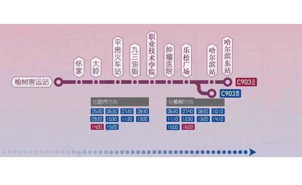 榆树市公路客运站、大岭站、怀家站、平房站、九三油脂站、职业技术学院站、肿瘤医院站、乐松广场站、哈尔滨站、哈尔滨东站。