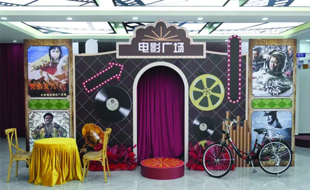 走进服务区,长达14米的长春电影制片厂发展历程、电影时光墙,向过往司乘人员“诉说”着往日时光;质朴的农家院、老旧的自行车、黑白电视机和具有年代感的海报等存在于影视的场景被一一还原;在室内大厅老电影观影区,司乘人员可免费观影。