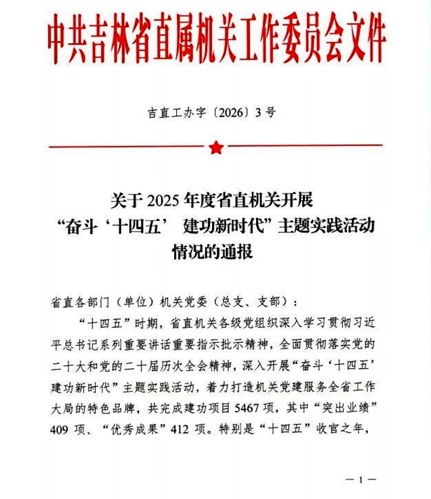 近日,中共吉林省直属机关工作委员会印发《关于2025年度省直机关开展奋斗十四五’   建功新时代主题实践活动情况的通报》,由省交通科学研究所科研开发中心承担的公路基础设施长期性能观测助力交通强国试点建设项目荣获优秀成果奖,为我所决胜90攻坚征程添上振奋一笔。
