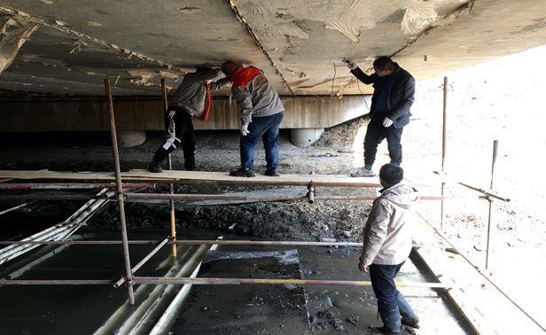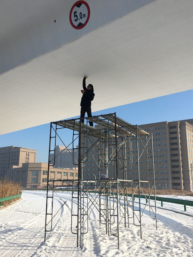 工作组成员秉承严谨的态度,深知外业任务的繁重,提前部署检测任务,从腊月严冬开始不畏严寒,穿梭在桥洞下、行走在冰面上、攀爬在高架处,采集所需的数据。由于市政道路交通繁忙,为避免长时间封路影响通行,保障桥检车辆顺利出动,检测任务往往从凌晨开始,持续到第二天清晨。虽然气温逐渐回升,检测环境有所好转,但桥下的冰面也随之消融,我们不仅要搭高架,还要在桥下“搭桥”以跨过冰水面,这种双重搭建的组合形势又加大了检测的难度。此次外业活动不仅要克服不良的检测环境,更要克服疫情期间的窘境。尽管特殊时期出行多有不便,工作餐基本都是露天解决,但是大家坚持了下来,完成了任务。