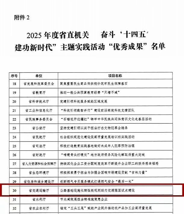 近日,中共吉林省直属机关工作委员会印发《关于2025年度省直机关开展“奋斗‘十四五’ 建功新时代”主题实践活动情况的通报》,由省交通科学研究所科研开发中心承担的“公路基础设施长期性能观测助力交通强国试点建设”项目荣获优秀成果奖,为我所“决胜90天”攻坚征程添上振奋一笔。