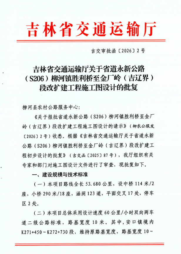 在“决胜90天”劳动竞赛的攻坚热潮中,由吉林省交通科学研究所主导的省道永新公路(S206)柳河镇胜利桥至金厂岭(吉辽界)段改扩建工程施工图设计全面高质量完成,于2026年2月5日正式获得省交通运输厅批复,这标志着吉林省首个普通国省干线公路由设计单位牵头的设计施工总承包(EPC)项目正式从蓝图迈入实体实施阶段。这一突破不仅为项目建设按下“快进键”,更开启了吉林交通建设模式创新的新篇章。