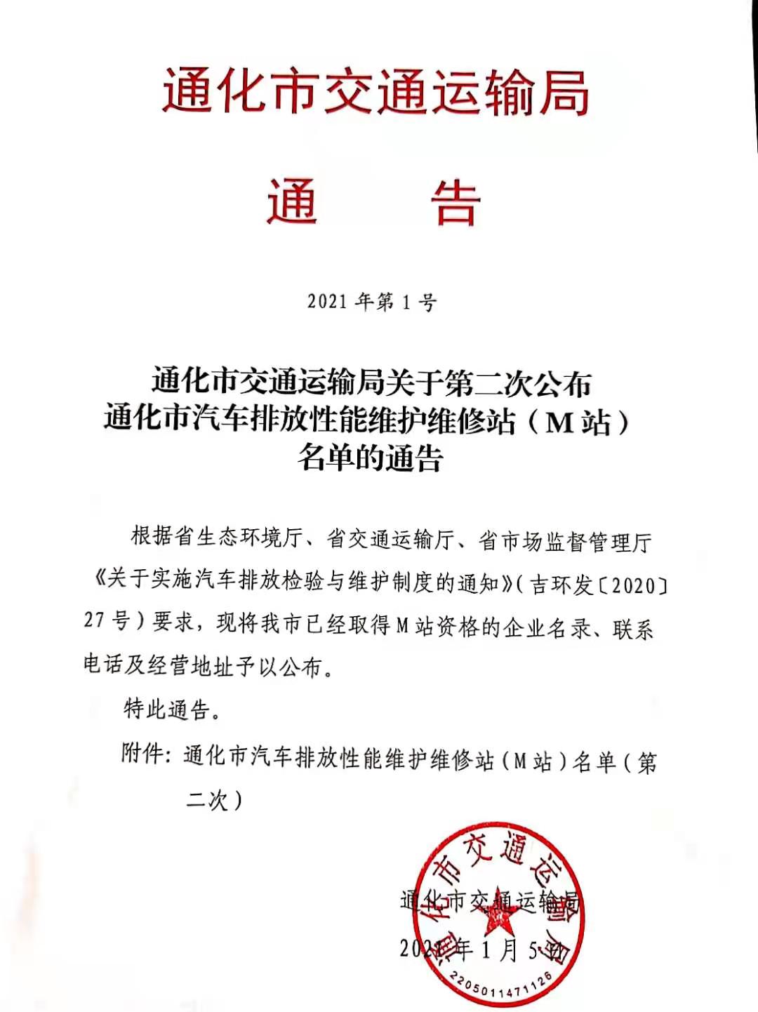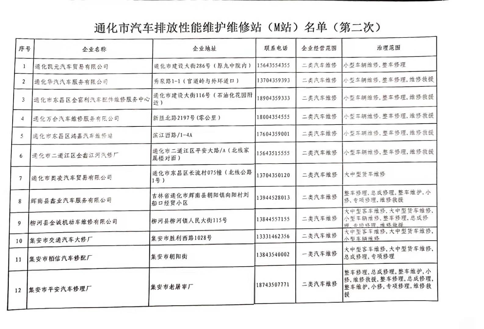 通化市汽车排放性能维护维修站(M站)名单(第二次)