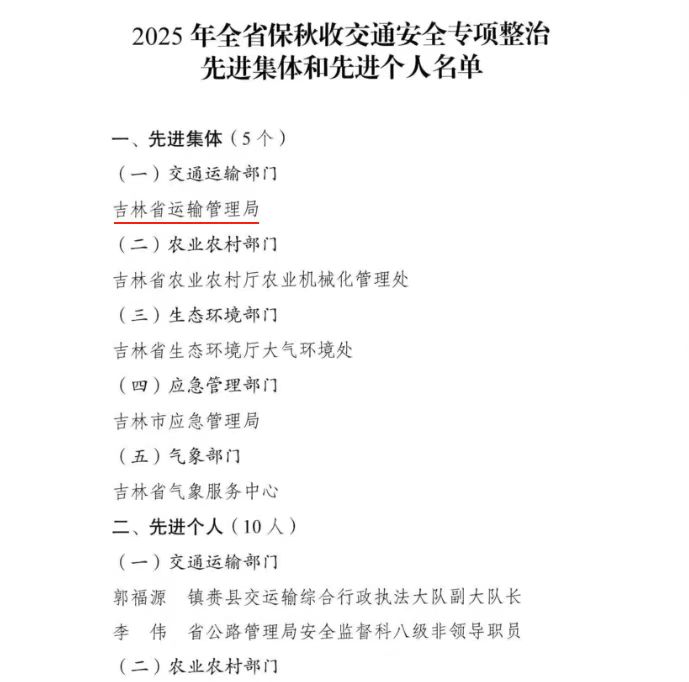 近日,吉林省交通安全委员会对全省保秋收交通安全专项整治行动中成绩突出的集体和个人予以通报表扬。