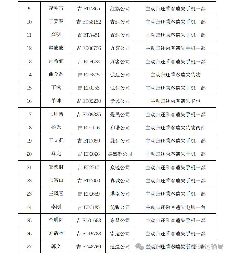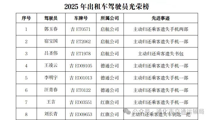 这些暖心善举,不仅为乘客挽回了财产损失,更以实际行动为行业树立了正面榜样,充分展现了我市出租车行业文明服务的崭新形象。现将2025年度出租车驾驶员光荣榜公布如下。