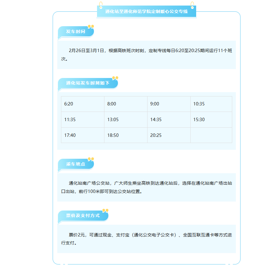 新学期开学在即,为全面减少师学生返校的舟车劳顿,通化市巴士公共交通有限公司开通了通化站至通化师范学院定制暖心公交专线,“一站式”直达学校。