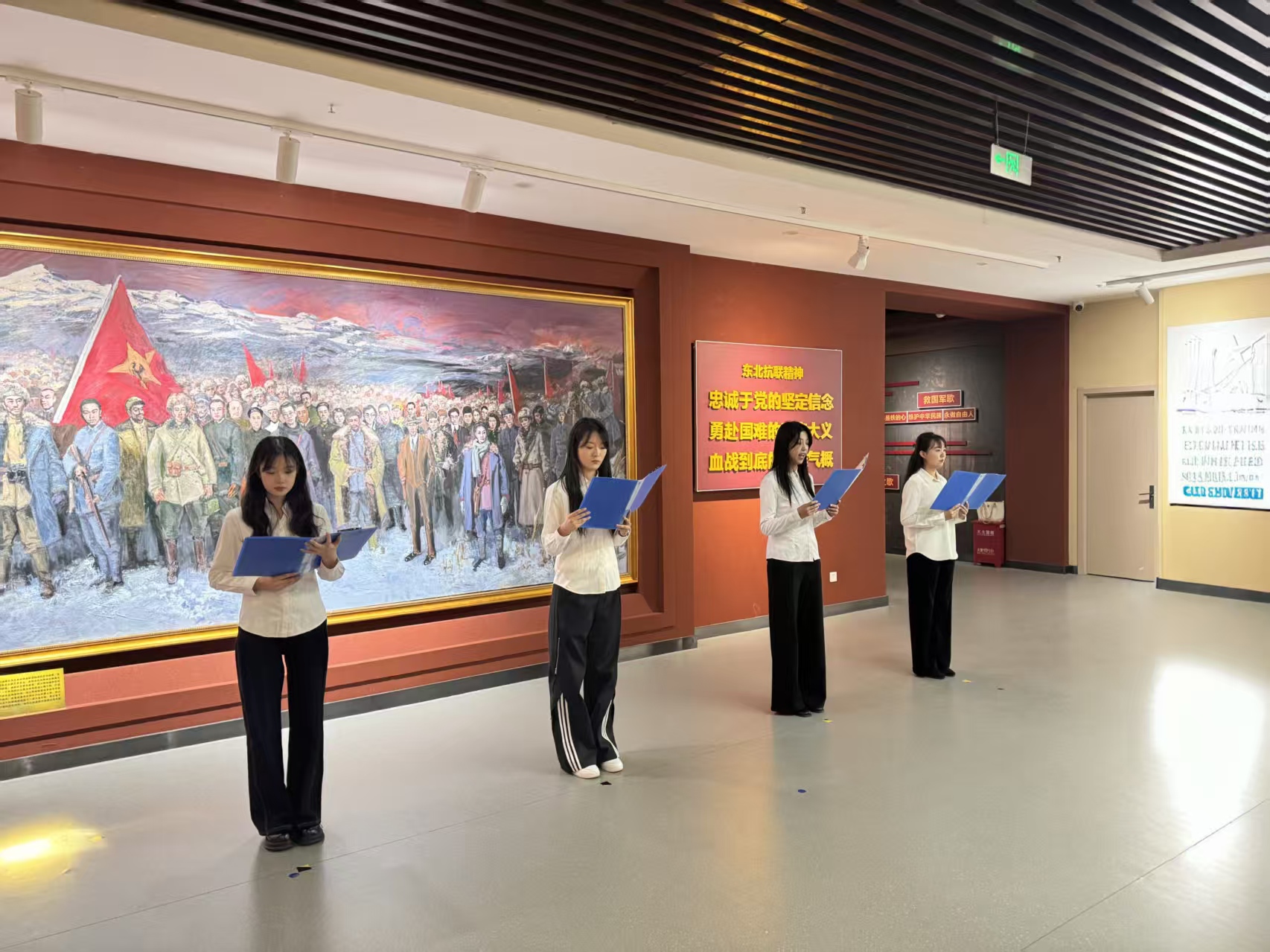 参观结束后,全体党员整齐列队,面向鲜红的党旗肃立,高举右拳,庄严重温入党誓词。铿锵有力的誓言在陈列馆内回荡,每一位党员都以坚定的信念重温对党忠诚的庄严承诺。随后,青年代表们带来饱含深情的诗朗诵,以慷慨激昂、真挚动人的词句,追忆抗日英烈的英雄壮举与不朽功勋,展现了青年一代传承红色血脉、励志奋勇争先的精神风貌。活动最后,全体人员来到英烈纪念区域,依次向英勇献身的抗日英烈敬献鲜花。大家神情庄重,缓步上前,将一朵朵鲜花轻轻摆放,以此寄托对革命先烈的深切缅怀与无尽哀思,向为民族独立和人民解放牺牲的英雄先烈致以最崇高的敬意,在静默中传承英烈精神,汲取前行力量。