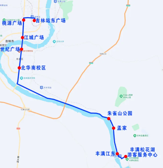 吉林站东广场、桃源广场、江城广场、世纪广场、北华南校区、朱雀山公园、孟家、丰满江东、丰满松花湖游客服务中心。