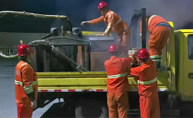 5:30,清障维修队队长范志涛来到灌缝作业车前,将准备好的固体灌缝胶提前投入料仓,点火、热机、调温,这些固体材料经过两个小时预热才能融化,他紧紧地盯着料仓,保证生产安全。