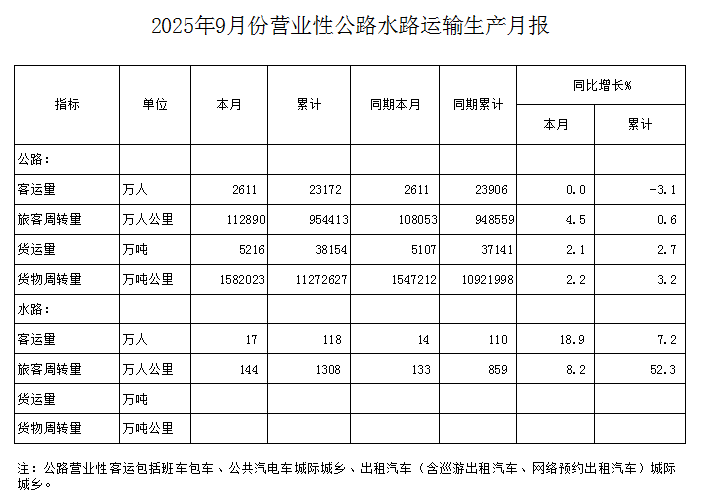 2025年9月份营业性公路水路运输生产月报
