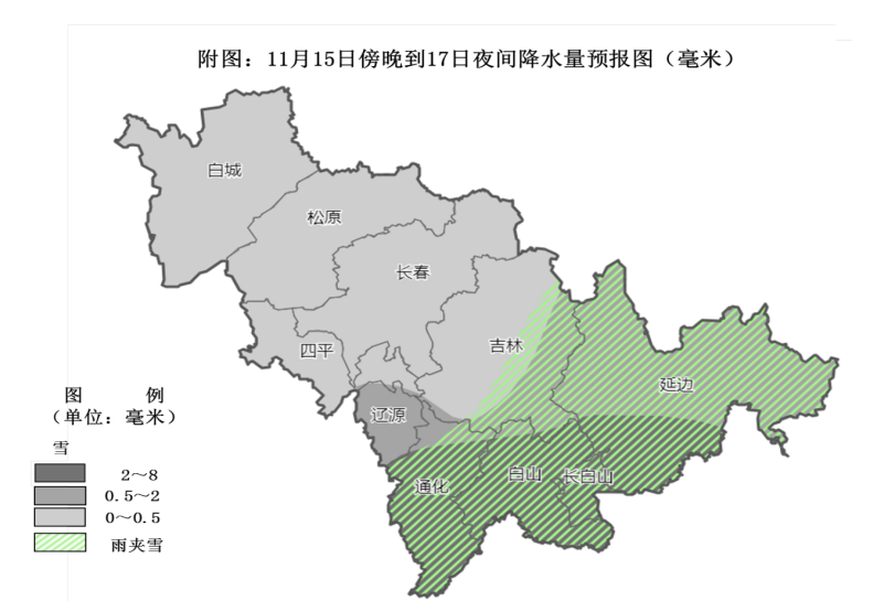 15日下午,长春东北部、吉林、辽源、通化北部有分散性雨夹雪;