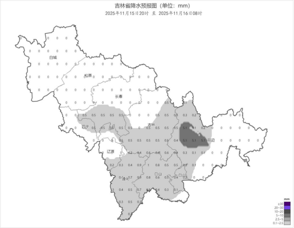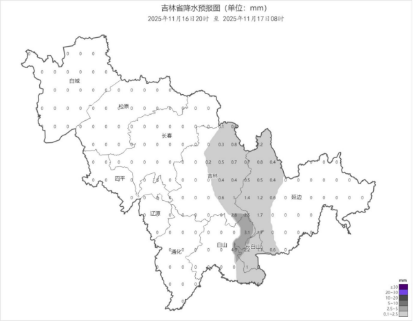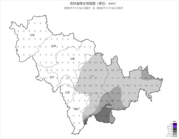 16日白天,长春东南部、四平东部、辽源、吉林、通化、白山、延边、长白山保护开发区有小雪或阵雪;