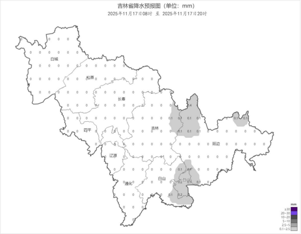 17日白天,辽源、吉林东部、通化、白山、延边、长白山保护开发区有小雪或阵雪;