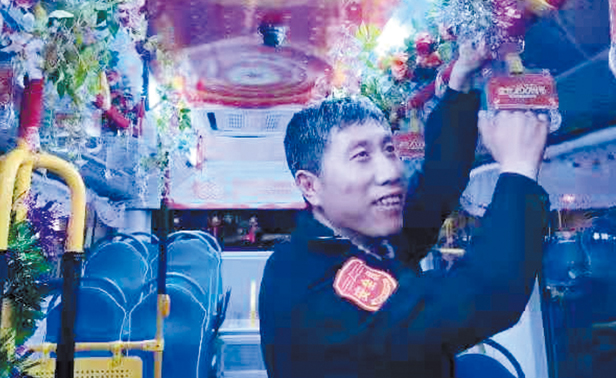 5:00,长春公交集团南通汽车公司驾驶员正在为上线运营做着准备,他们亲手布置车厢装饰,共同庆祝劳动者自己的节日。