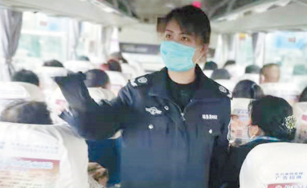 6:20,长春凯旋公路客运站站务员正在进行发车前的安全检查,并提醒乘客系好安全带、正确佩戴口罩,确保乘客假期出行安全。
