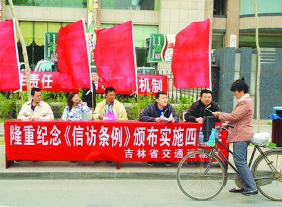 为保护信访人的合法权益,维护信访秩序,纪念《信访条例》颁布实施4周年,5月15日,省交通运输厅办公室组织了《信访条例》的宣传活动。厅有关处(室)、厅直有关单位的工作人员对《信访条例》相关内容及信访人须知进行了宣传,并向路人发放了宣传单。(张士鹏 摄影报道)